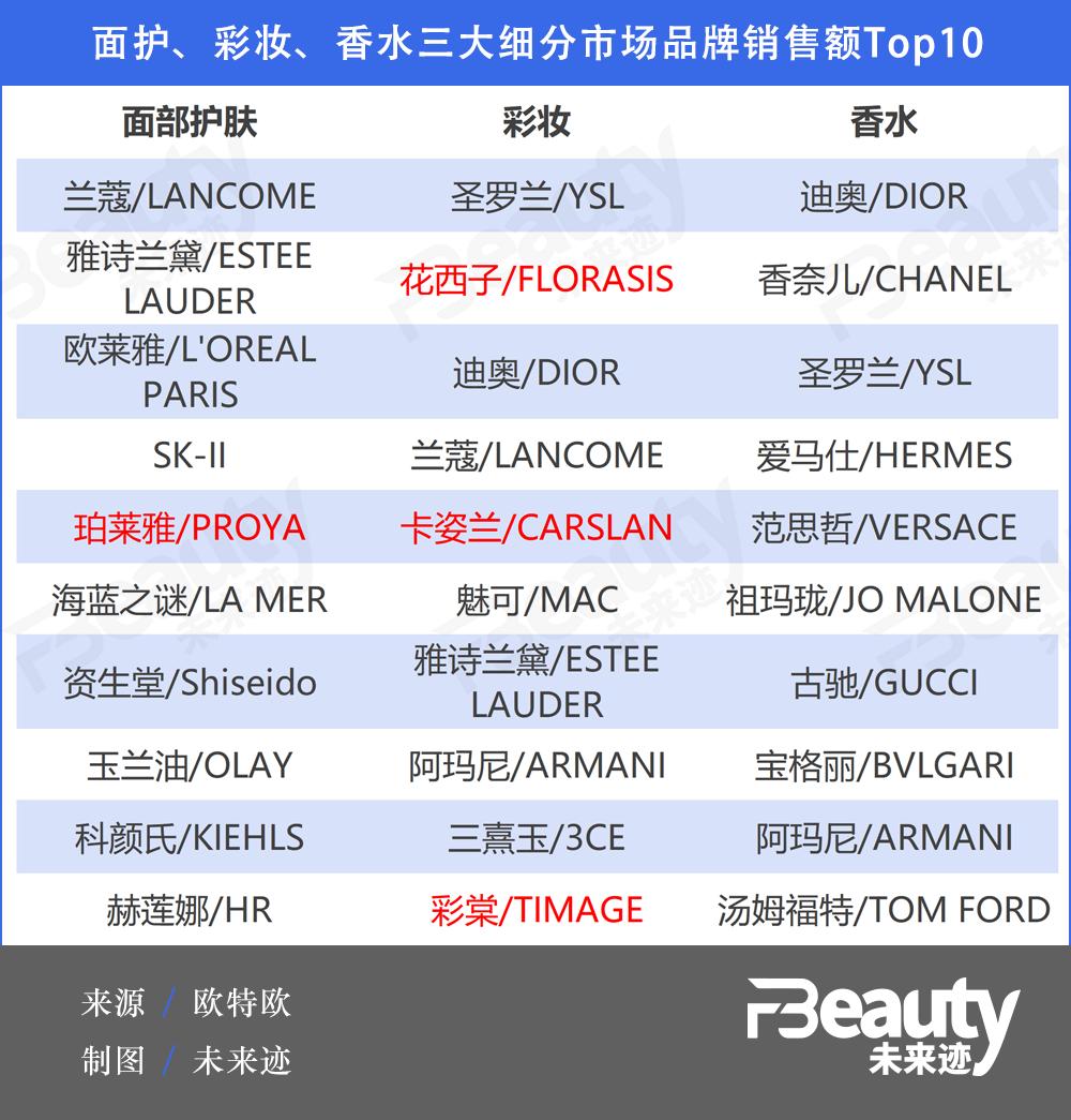 与美容仪、面膜市场不同,面部护肤和彩妆市场虽总额最高,但长期被国际大牌主导。结合护肤、彩妆、香水这三个细分市场5月销售额TOP10品牌来看,面部护肤仅有珀莱雅这一个国货闯入榜单,彩妆市场国货与外资品牌比例为3:7,香水品牌最为夸张,国货在榜率为零,以迪奥、香奈儿、圣罗兰等奢侈品品牌为主。
