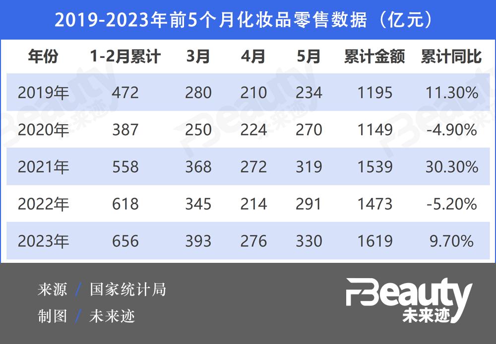 2023年5个月化妆品类零售市场总额累计则达1619亿,同比去年增长9.7%,增速跑赢社零大盘的0.4个百分点,整体看市场正加速复苏。