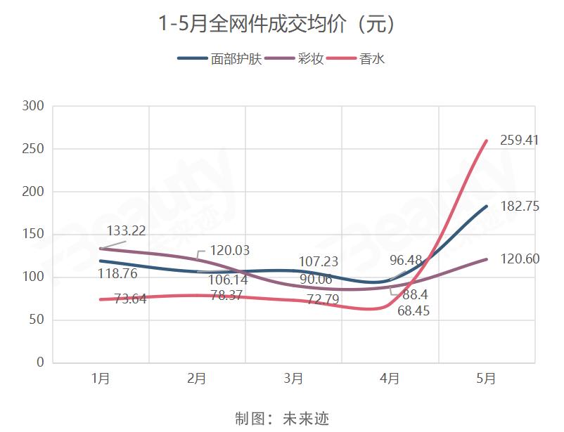 欧特欧咨询提供的数据显示,面部护肤、香水5月均价远高于1-4月,香水更是高达259.41元,彩妆均价略低于1月,但远远高于4月均价。