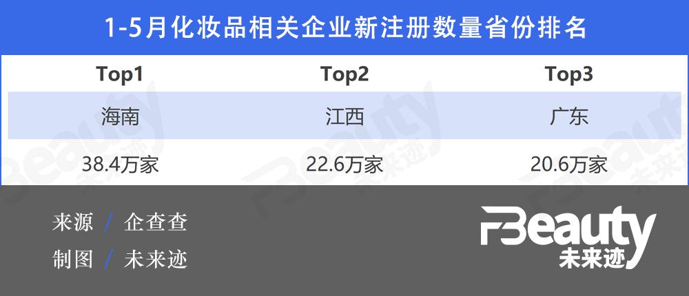 分省份看,2023年1月至5月,海南省新注册38.4万家化妆品相关企业,排名全国省份第一;其次是江西新注册22.6万家相关企业、广东新注册20.6万家相关企业,位列全国省份前三。
