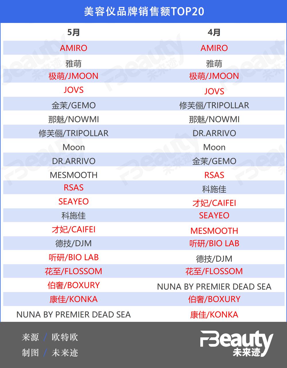 值得一提的是,国货品牌AMIRO、极萌/JMOON、JOVS站稳TOP4席位,且AMIRO销售额高达10亿,同比增长193.81%,成绩亮眼,去年(2022年)1月创立的新品牌极萌/JMOON也进入前3。而在TOP20的榜单中,国货共占10个,在站位上和外资品牌打平,且从4月、5月的对比来看,已经处于相对稳定的状态。