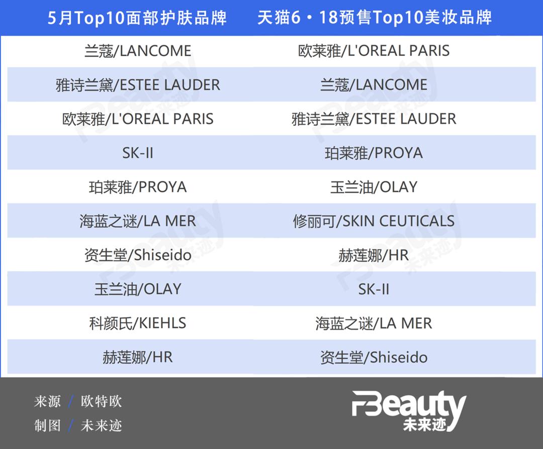另一个细节也可以佐证这个观点。《FBeauty未来迹》发现,5月单月全网Top10的护肤品牌,与天猫6·18预售期间美妆品牌Top10榜单呈现90%的高度吻合(前者有科颜氏,后者有修丽可),兰蔻、雅诗兰黛、欧莱雅、SK-II、珀莱雅、海蓝之谜、资生堂、OLAY、赫莲娜9个品牌均登上两个榜单,仅销售额排名有变化。