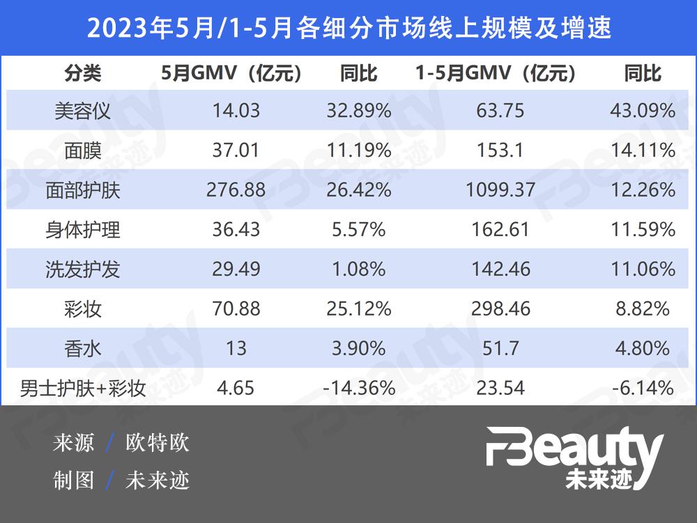 《FBeauty未来迹》从欧特欧咨询获取的数据显示,从2023年1-5月的累计销售额来看,护肤、彩妆、香水、洗护发等7大细分市场都呈增长状态,但男士护肤和彩妆出现负增长。