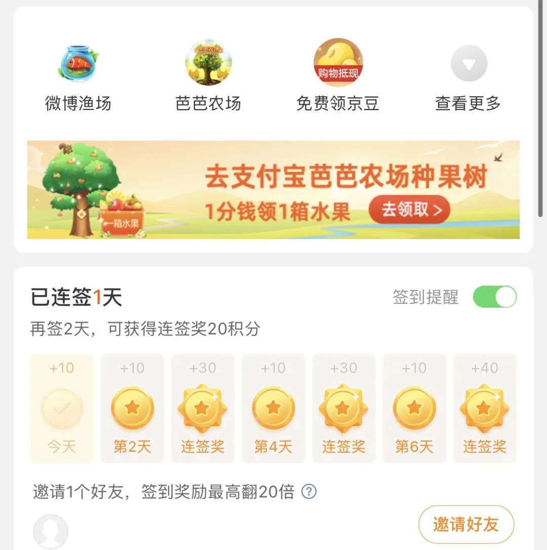 大部分APP都有签到功能,类似的还有每日任务,用户使用后都需要自己手动领取奖励,签到功能最核心的目的就是留住用户,培养用户每天都打开app习惯。例如: