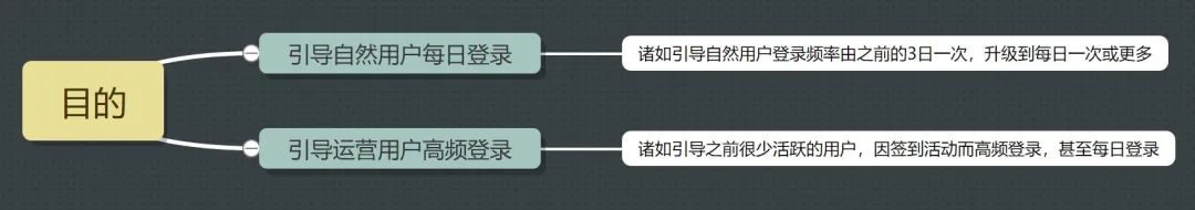 而签到活动,作为一种运营干预手段,其目的是通过激励来吸引用户连续签到,然后借此促进用户每日登录或活跃。其目的主要有以下两个: