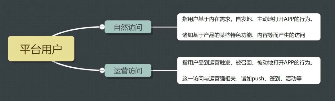 理解这个含义先从理解用户说起。通常,在运营层面,我们可以将用户登录分为两大类(如下图),也即自然访问和运营访问;
