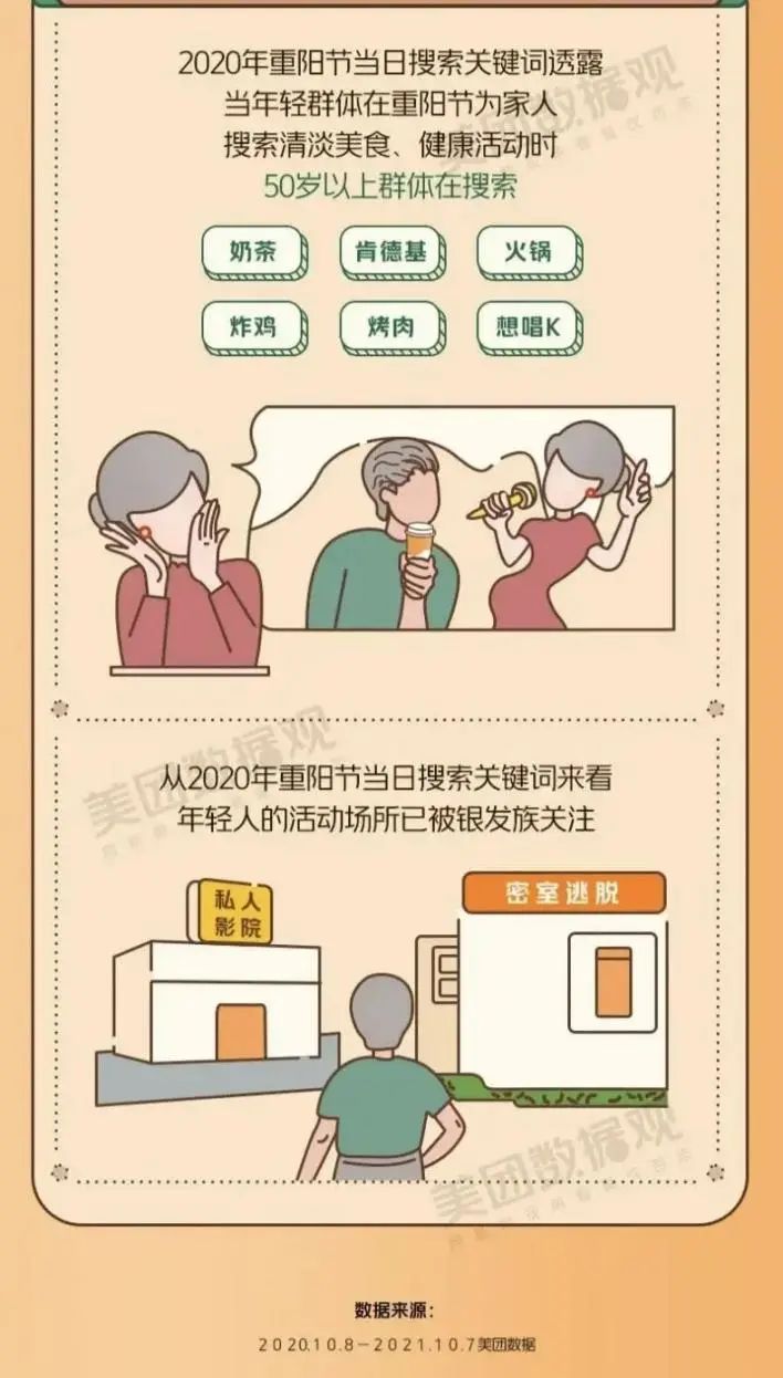 当老年人在年轻人的影响下接触到美团,他们会逐渐发现,数字化产品可以如此方便快捷地丰富晚年生活。2020年重阳节的美团搜索关键词显示,50岁以上中老年群体喜欢搜索奶茶、肯德基、火锅、炸鸡、烤肉,还想要KTV、私人影院、密室逃脱这类年轻人十分偏爱的“网红”场所。