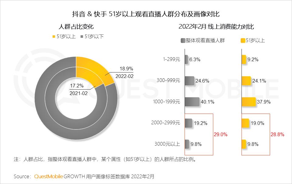 根据QuestMobile发布的《2022年中国短视频直播电商发展洞察》,在2022年的抖音、快手,41岁以上用户占比36.3%,51岁以上用户占比也有18.9%,近三成月度线上消费能力超2000元。中老年人会在日常生活中观看直播,线上付费金额也一步步提高,中老年群体的需求在短视频和直播平台上快速释放。