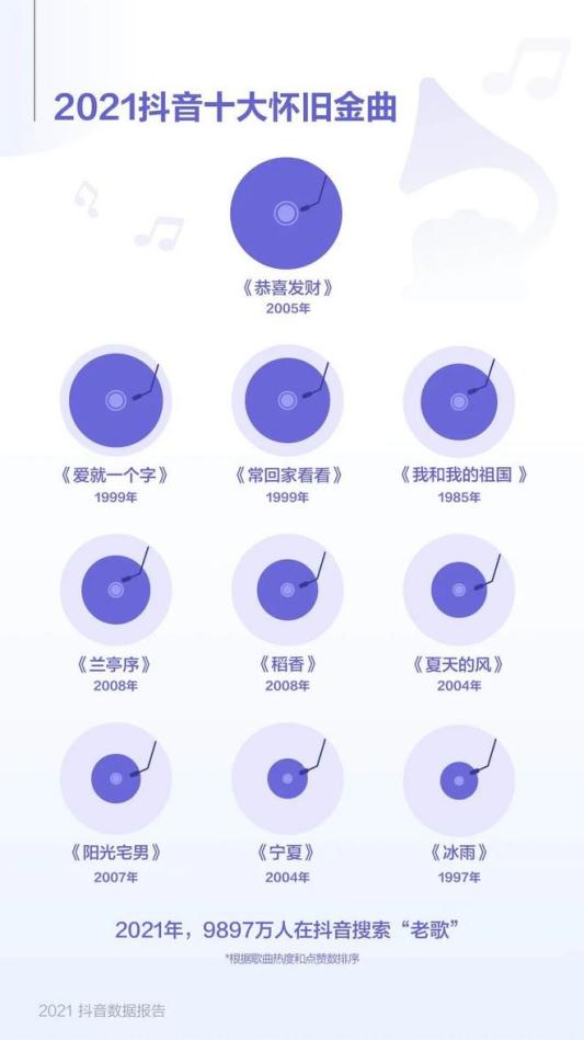 根据《2021抖音数据报告》,“退休”在抖音被记录了715万次。老年人的日常娱乐从电视节目转移向抖音:9897万人在抖音搜索“老歌”;传统文化类主播收入同比增长101%,其中,曲艺类主播收入同比增长232%。