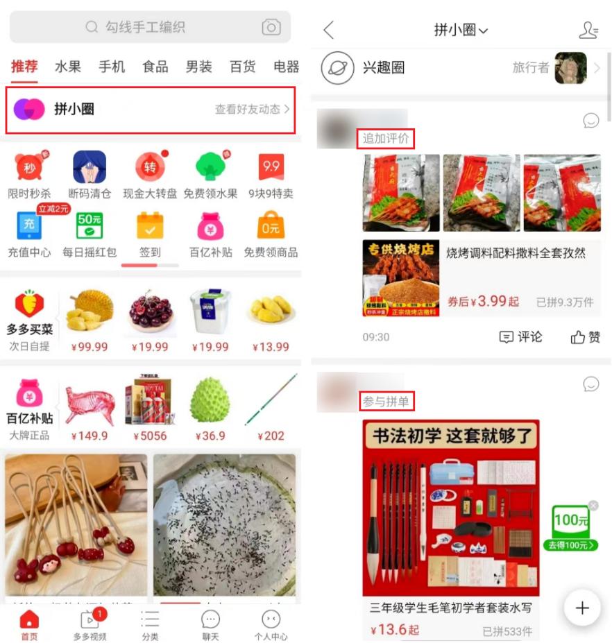 2020年,拼多多推出拼小圈功能,希望发挥“熟人效应”,增强用户粘性,增加复购。这项功能会将用户订单自动同步,这意味着每一个开启“拼小圈”的人,都在把自己的消费记录与所有朋友公开。