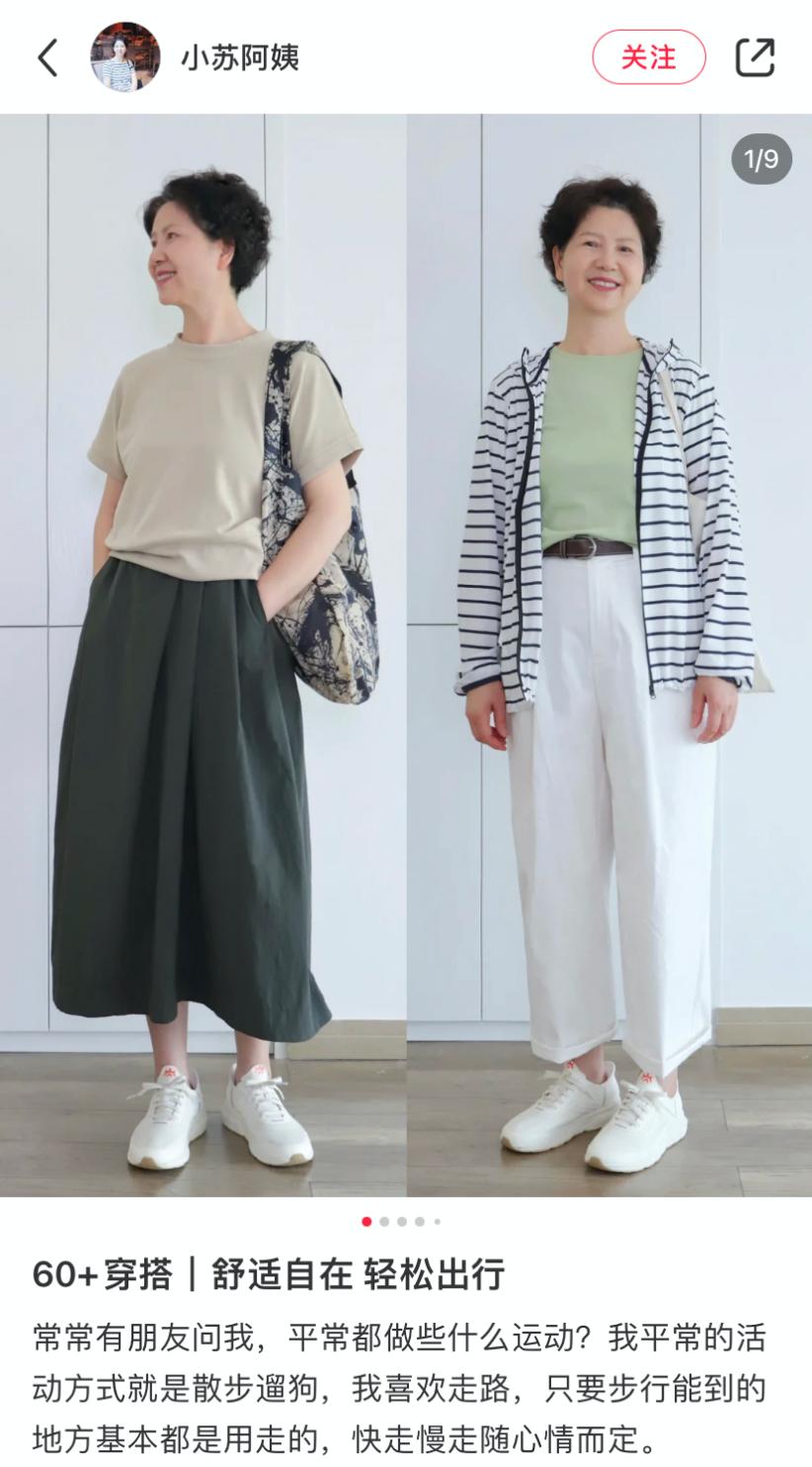 60岁+的@小苏阿姨 从年轻时就喜欢穿好看的衣服,退休后在小红书分享日常穿搭。她的穿搭单品多为纯色基础款,风格简约自然,全年龄适配。每篇笔记下都有网友求衣服的品牌和货号,她们不仅想给妈妈买,还想给自己来套同款。