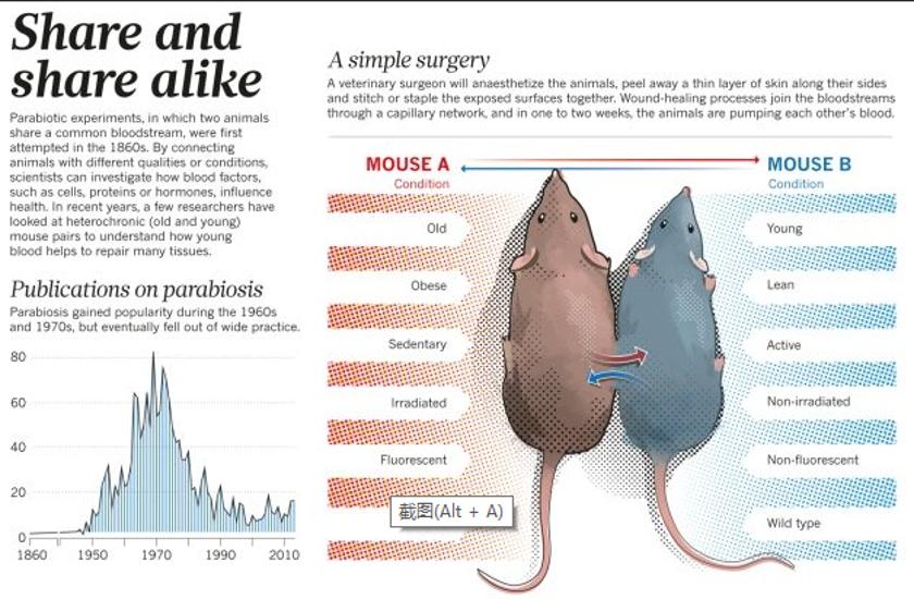 到了上世纪50年代,康奈尔大学(Cornell University)的克莱夫·M·麦凯(Clive M. McCay)和同事曾将幼龄鼠的血液输入老龄鼠体内,借此检验年轻人的血液可能含有能让老年人恢复活力的物质。为了做到这一点,他们将两只大鼠的侧腹皮肤缝在一起,使它们连接起来。经过被称作异种共生的这一步后,血管生长出来,两只老鼠的循环系统融合在了一起。幼龄鼠的血液流入了老龄鼠的体内,老龄鼠的血也流进了幼鼠。