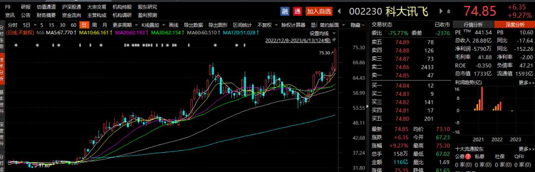 在星火认知大模型的手机版本上线的前后几天里,科大讯飞股价再度拉升近17%(6月9日-14日),6月14日收盘价达到75.13元。