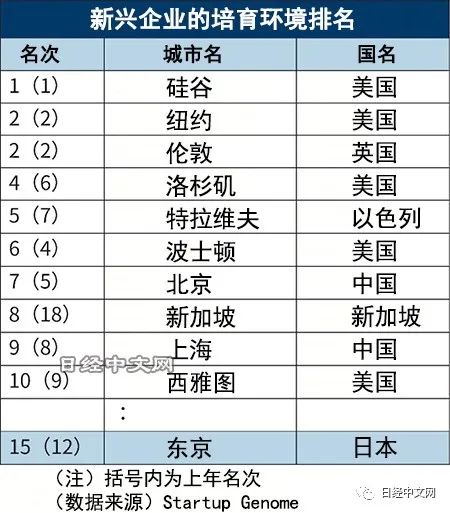 全球新兴企业培育环境排名:北京7,东京15