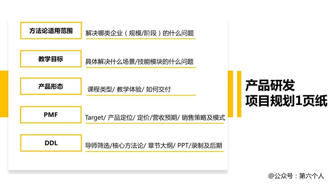 我以教育和知识付费的产品研发项目作为一个虚拟模拟,整理了1页纸。产品研发项目关系企业营收变现,因此,任何一个研发项目立项都很重要。要聚焦和讨论的东西非常明确,在不能达成共识之前,产品研发是无法顺利启动的。