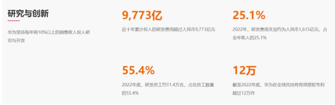 根据华为官网最新资料显示,2022年底,华为研发人员约11.4万名,占总员工数量的55.4%。研发经费支出约为1615亿人民币。
