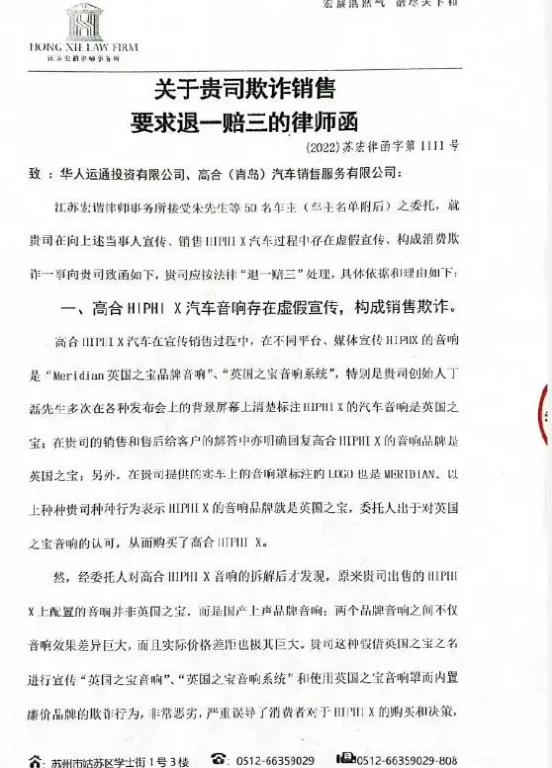 车主们列出了高合汽车的三大“罪状”:其一,音响以次充好,宣传资料中标名音响是“Meridian英国之宝品牌音响”,但实际拆开后发现,车上的音响是国产上声音响,而且两者的音响效果和价格差异巨大;其二,内饰材质夸大用料材质,宣传采用“半苯胺内饰”,而实际销售的座椅部分的皮革是半苯胺真皮,而门板和中控等位置却采用的是人造革;其三,电池偷工减料,对外宣传电池容量为97kWh,但实际拆开后发现只有94.3kWh。