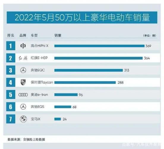 排除来排除去,最后只剩下红旗E-HS9、奔驰EQC、保时捷Taycan、奥迪e-tron、宝马iX等滞销车型。看完高合的销量图表,普通人会产生错觉“哇,高合居然打败了BBA和保时捷耶”。