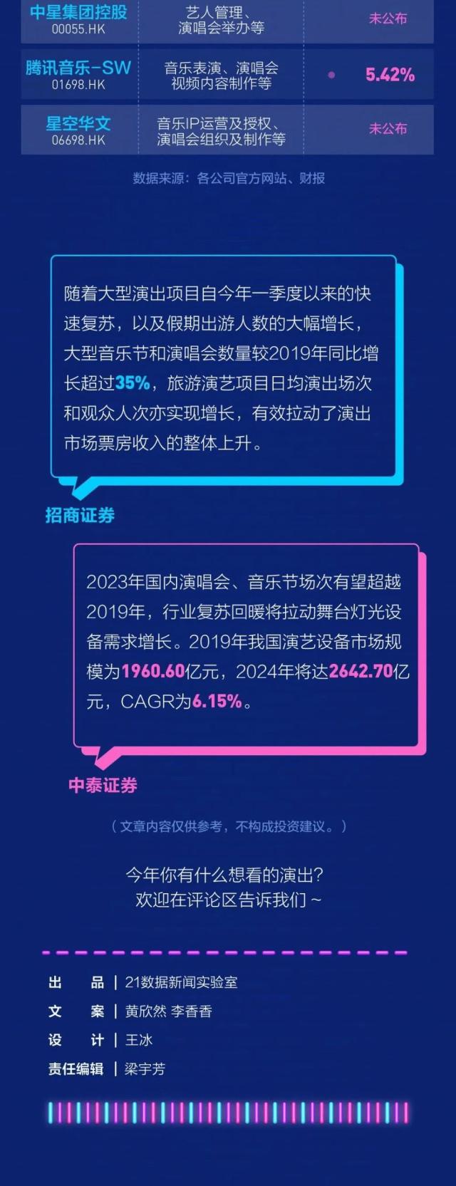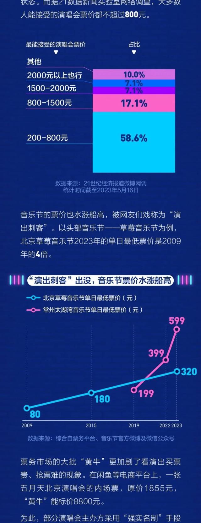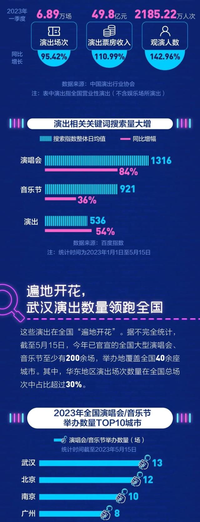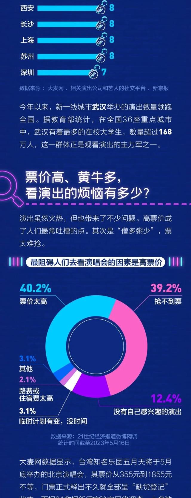 相信大家在朋友圈都看到过类似上图的场景吧。今年演唱会经济迎来了指数型增长,至今全国已经举办了近500场演唱会。票房究竟有多火爆?仅一季度薛之谦的四场演唱会就突破了4000万。前段时间频上热搜的五月天“2023好好好想见到你”演唱会更是引发了“鸟巢门口站,不让黄牛赚”的热议。下面这张由21数据新闻实验室制作的图片可以给各位更加直观的感受。