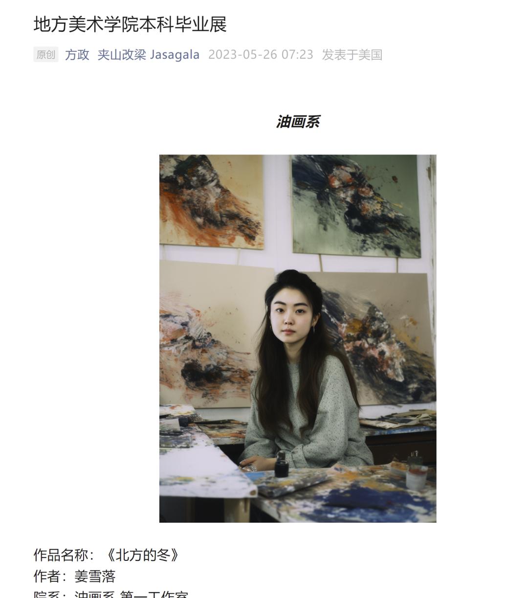 公众号“夹山改梁Jasagala”曾发布了一篇名为《地方美术学院本科毕业展》的推文,使用Midjourney与ChatGPT生成了一系列学生照片、作品图片、姓名、作品名称以及阐述。