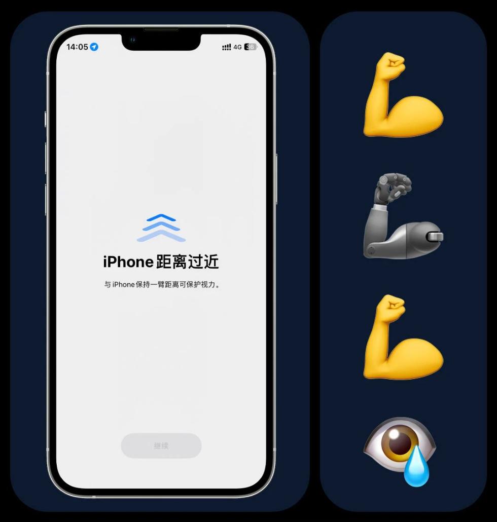 要是你在玩手机的过程中把 iPhone 拿得太近,并且持续一段时间,系统就会提醒你保持「 一臂距离 」,从而帮助你缓解眼睛疲劳保护视力健康。
