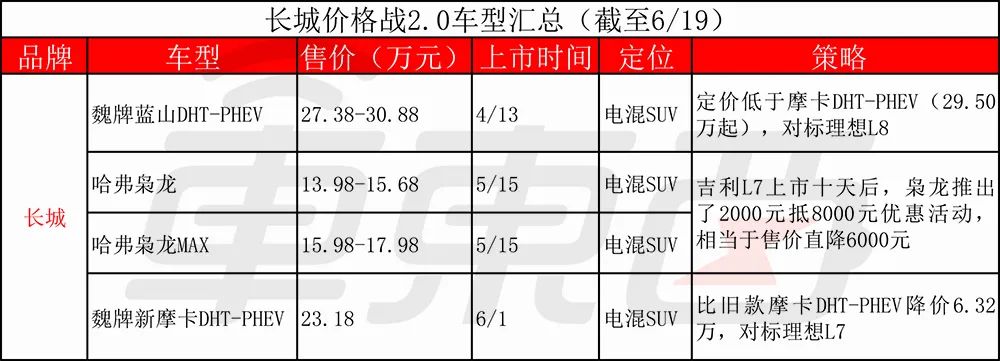 除了这三家外,在今年二季度,还有多家中国车企加入价格战,而这些车企大佬们也都长了个“心眼”,大多都不选择直接“喊麦”、“流血降价”,而是选择“全军出击”、“降本调价”,甚至直接“降价增配”,促销手段花样百出,特别是10万~30万价格区间的电混SUV市场“战火连天”。