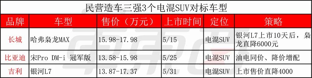 而吉利的中高端车型银河L7,则是选择继两个竞品——哈弗枭龙(起售价为13.98万)上市15天、比亚迪宋Pro DM-i冠军版(起售价为13.58万)上市6天之后上市。