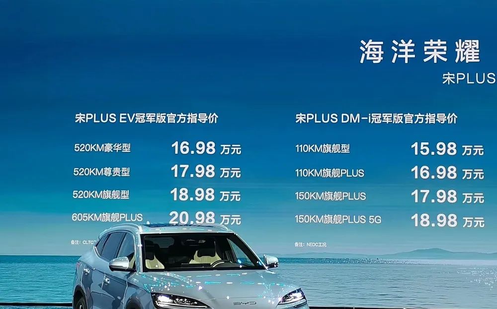 刚刚,比亚迪宋PLUS 冠军版正式上市!纯电版本售价16.98~20.98万元,DM-i版本售价15.98~18.98万元,比预售价格都降低1万元!