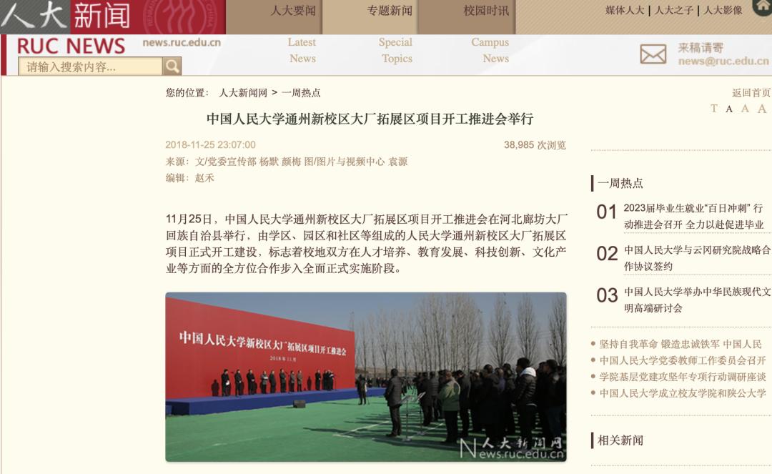 人民大学官网也登载:“(2018年)11月25日,中国人民大学通州新校区大厂拓展区项目开工推进会在河北廊坊大厂回族自治县举行,由学区、园区和社区等组成的人民大学通州新校区大厂拓展区项目正式开工建设,标志着校地双方在人才培养、教育发展、科技创新、文化产业等方面的全方位合作步入全面正式实施阶段。”