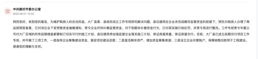 相关部门主要做了三项工作:“目前,大厂县已成立延期交付项目工作专班,并开展了三项工作:一是指导企业筹集建设资金,督促项目建设进度;二是盘活剩余资产,增加资金筹集渠道;三是设立企业共管账户,保障销售回款用于工程建设。”