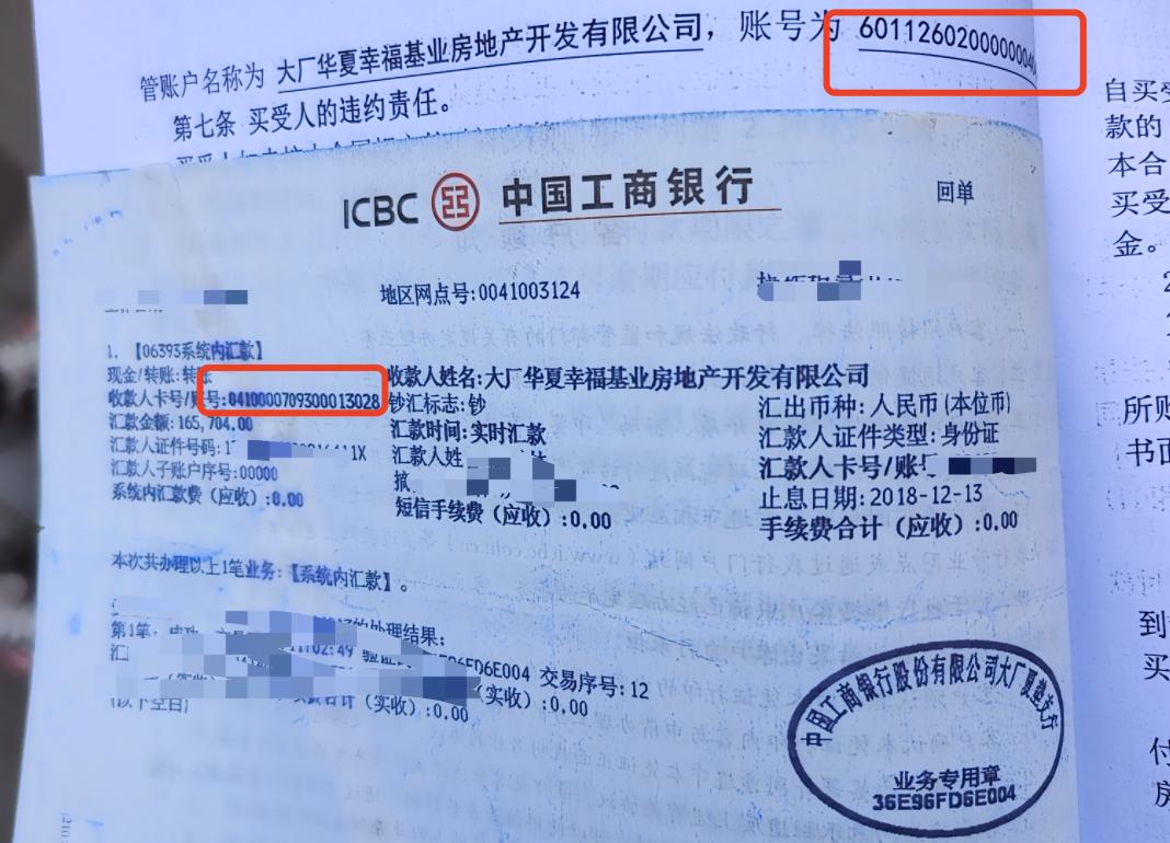 《每日经济新闻》记者看到了詹平向华夏幸福的汇款单,收款账户并不是购房合同中显示的预售资金监管账户。詹平说:“我是一年内分4次向华夏幸福交的全款,每次的收款账户都不一样。”