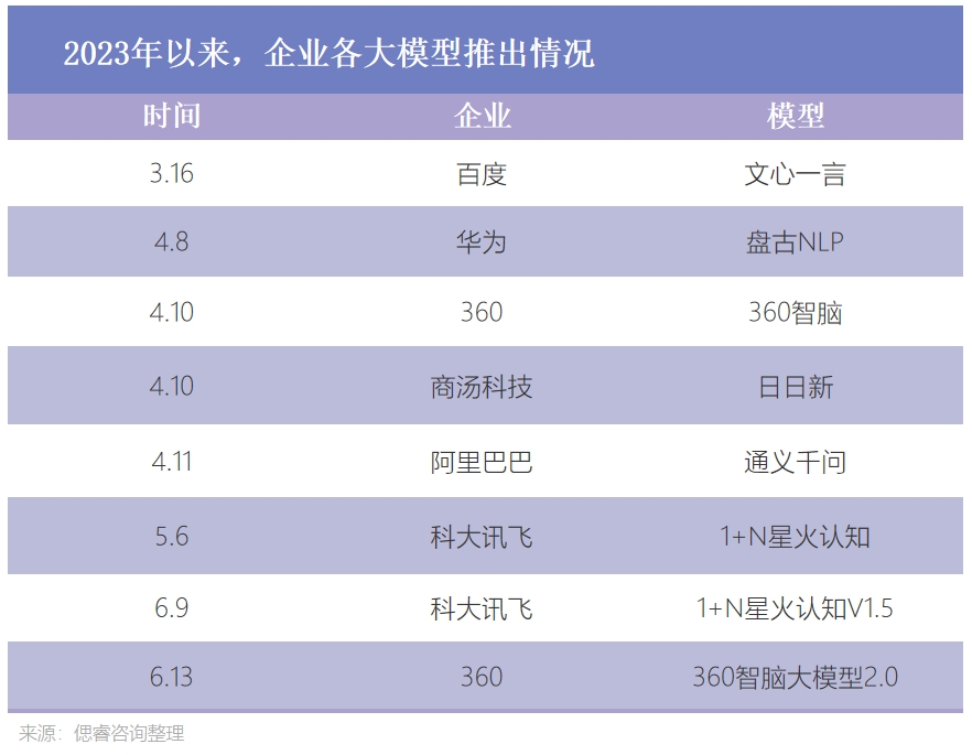 现阶段,各个大厂的游戏方式是,用重投入博取“诗和远方”——推出通用大模型,下放至自己的各个业务。截止6月13日,仅仅是国内已有6个大模型发布。