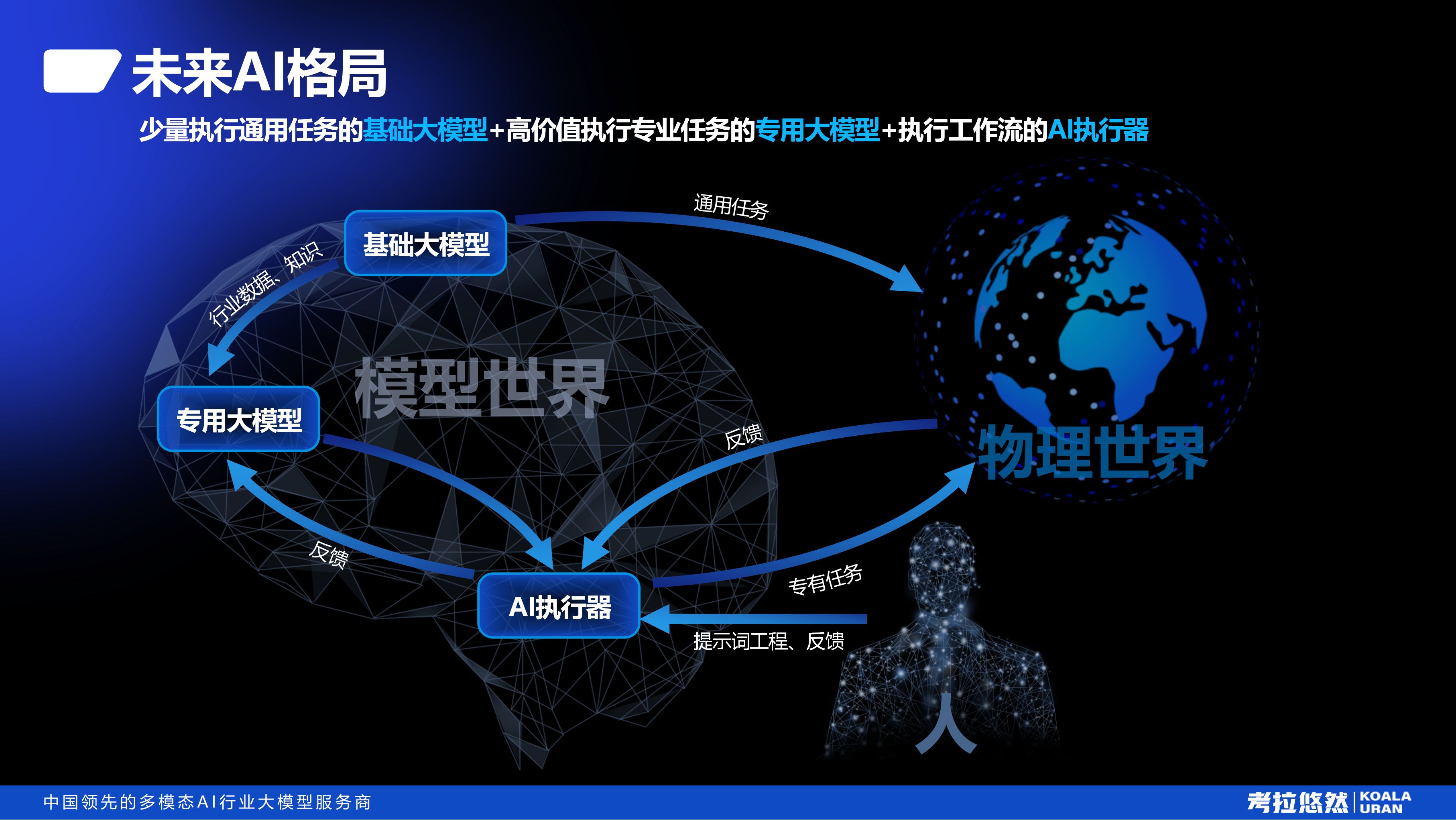 与中金证券的研判类似,考拉悠然认为,未来的AI格局,将由少量执行通用任务的基础(通用)大模型+高价值执行专业任务的专用大模型+执行工作流的AI执行器组成。