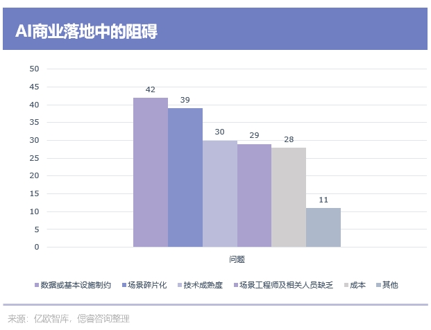 大模型吹散了由泛化能力差导致的“雾霾”,却没能吹倒路上的荆棘丛。据亿欧智库调研发现,数据或基本设施制约、场景碎片化、技术成熟度低是AI落地中TOP3的阻碍,而大模型仅仅缓解了数据制约、场景碎片化问题。
