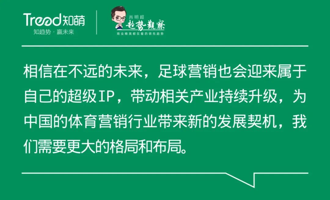 相信在不远的未来,足球营销也会迎来属于自己的超级IP,带动相关产业持续升级,为中国的体育营销行业带来新的发展契机,我们需要更大的格局和布局。