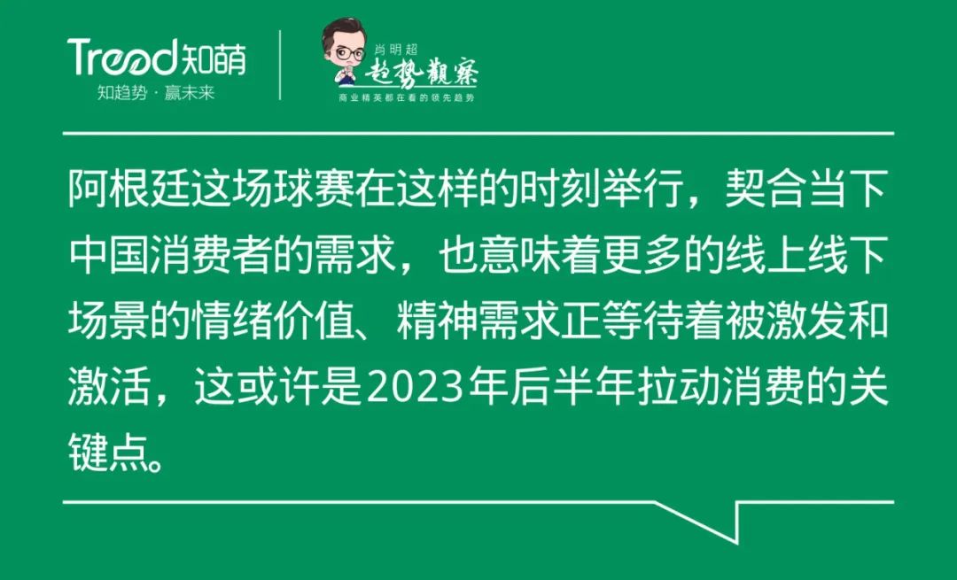 在中国经济正在“渐进式回暖”的背景下,“梅西中国行”有着别样的意义,正在展示着中国消费市场感性的一面:消费者需要更多的松弛感、情绪价值和精神慰藉。阿根廷这场球赛在这样的时刻举行,契合当下中国消费者的需求,也意味着更多的线上线下场景的情绪价值、精神需求正等待着被激发和激活,这或许是2023年后半年拉动消费的关键点。而就在此之前,五月天演唱会的一票难求已经在验证这一点,而淄博烧烤的火爆,某种程度上也代表着今天中国消费者对于“情绪消费”以及那些更能够激发人们共情内容的期待。