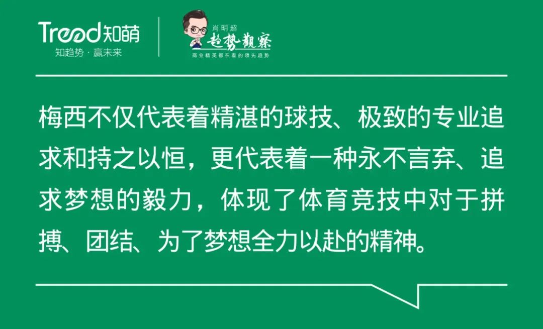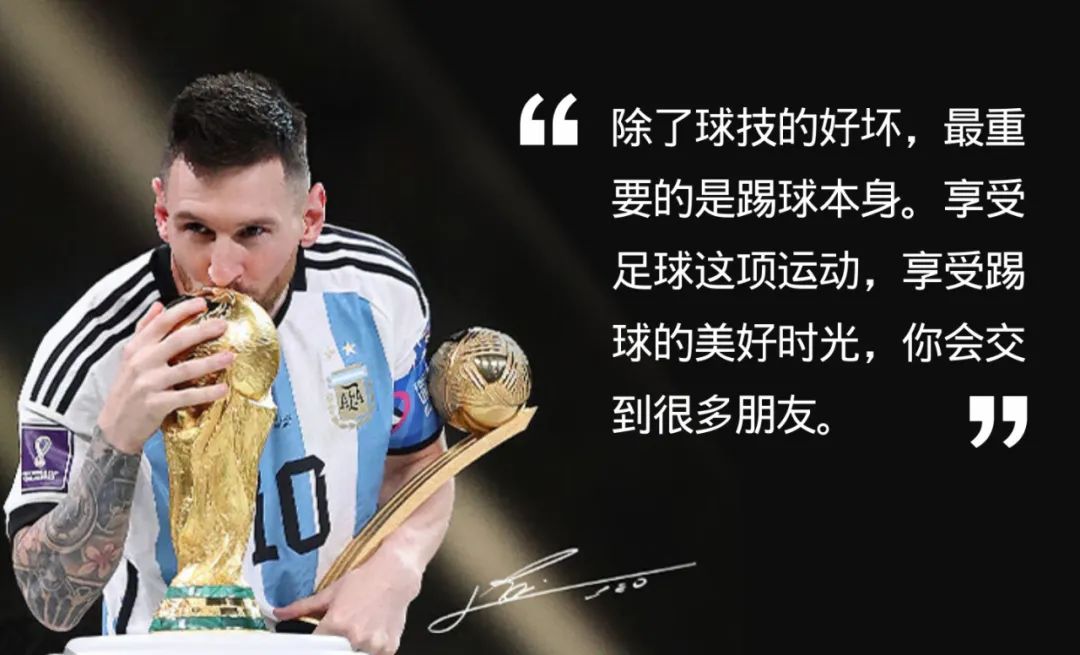 梅西不仅代表着精湛的球技、极致的专业追求和持之以恒,更代表着一种永不言弃、追求梦想的毅力,体现了体育竞技中对于拼搏、团结、为了梦想全力以赴的精神。这些要素让梅西不仅成为了足球世界的传奇、体育商业的标本、被全球追崇的超级偶像、有着顶级流量的IP,更成为年轻人的偶像,球迷的精神寄托,他的身上融合了太多的要素,这些要素,源自于足球这项竞技运动,却又早已超越了这项运动。