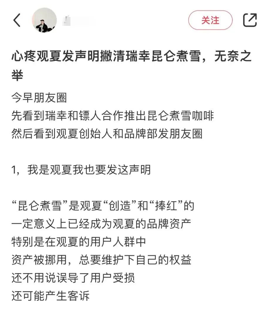 观夏方面认为,品牌旗下“昆仑煮雪”系列名称具有独创性,且产品已经获得了一定的市场影响力,如今瑞幸咖啡新品与其“撞名”,故发布声明提醒消费者,该咖啡产品与观夏品牌方无关。