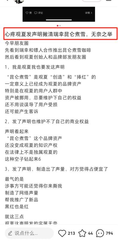有人进一步指出,这次观夏的公关声明是一个“昏招”。“第一次接触观夏的时候真的一眼爱上,视觉系统超级强大,内容也很好,一直在持续关注,但是这个‘昆仑煮雪’事件很败好感,‘昆仑煮雪’不是观夏第一个造出来的词,还发个声明,估计瑞幸很多受众都不知道这个品牌。”