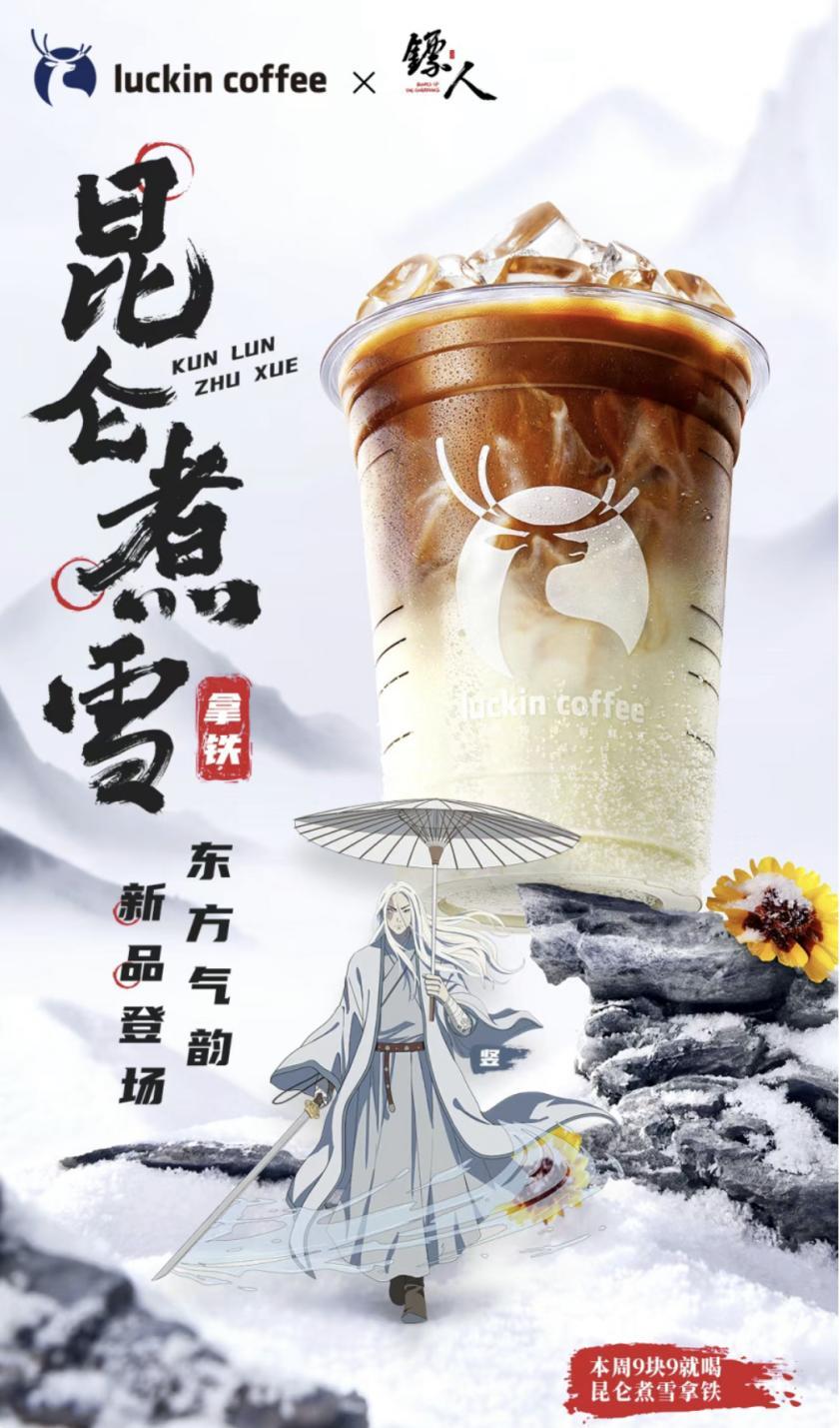 原来,2023年4月,瑞幸咖啡推出门店限定款“昆仑煮雪拿铁”,并在菜单中标明“昆仑拿铁新品,灵感来源自东方植物香”。随后6月19日,此新品在全国门店上线。
