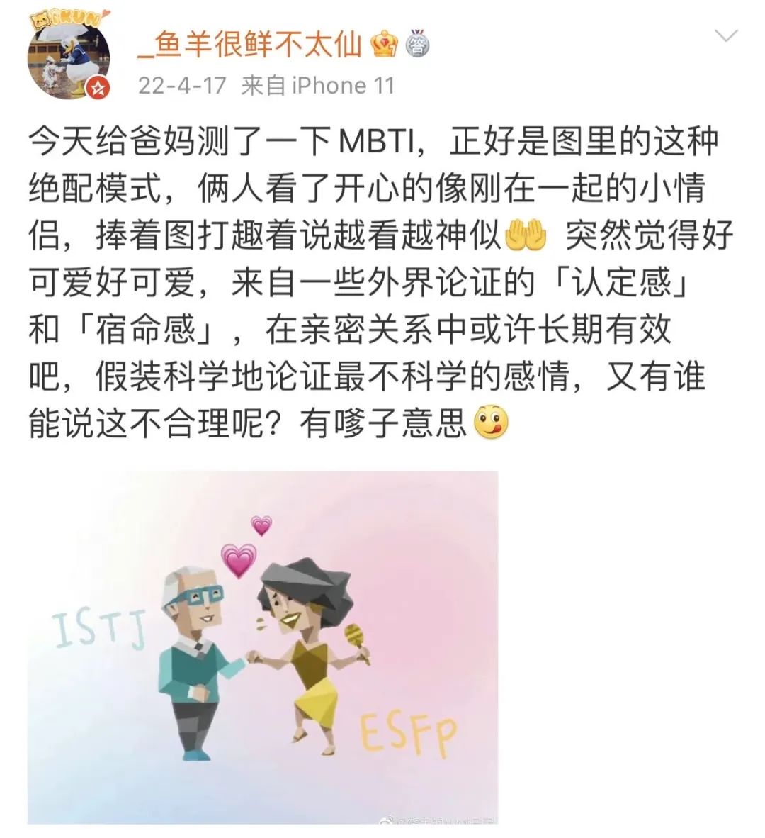 我知道MBTI经常被诟病的一点,是把人标签化,甚至被看作“伪科学”。其实我从来没有以科学的视角去看待MBTI,我就是觉得它挺好玩的。