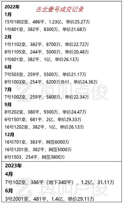 再看看古北壹号,1亿以上总价2022年一年成交4套,今年4月、6月分别只成交了2套。