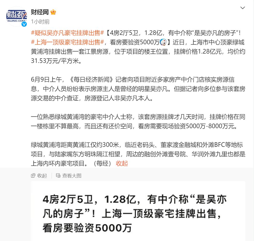 而无独有偶,最近的明星新闻里,不乏这种抛售的,比如有中介称“吴亦凡价值1.28亿的房子”,绿城黄浦湾挂牌正在出售