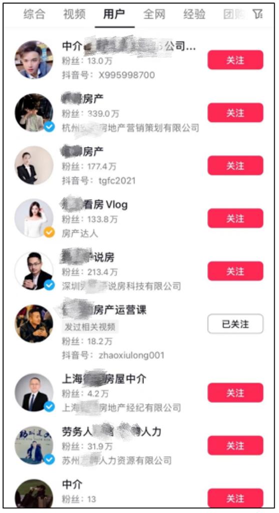 从粉丝量来看,目前在抖音短视频赛道上,有百万粉丝的头部中介,也有几十个粉丝的小中介。