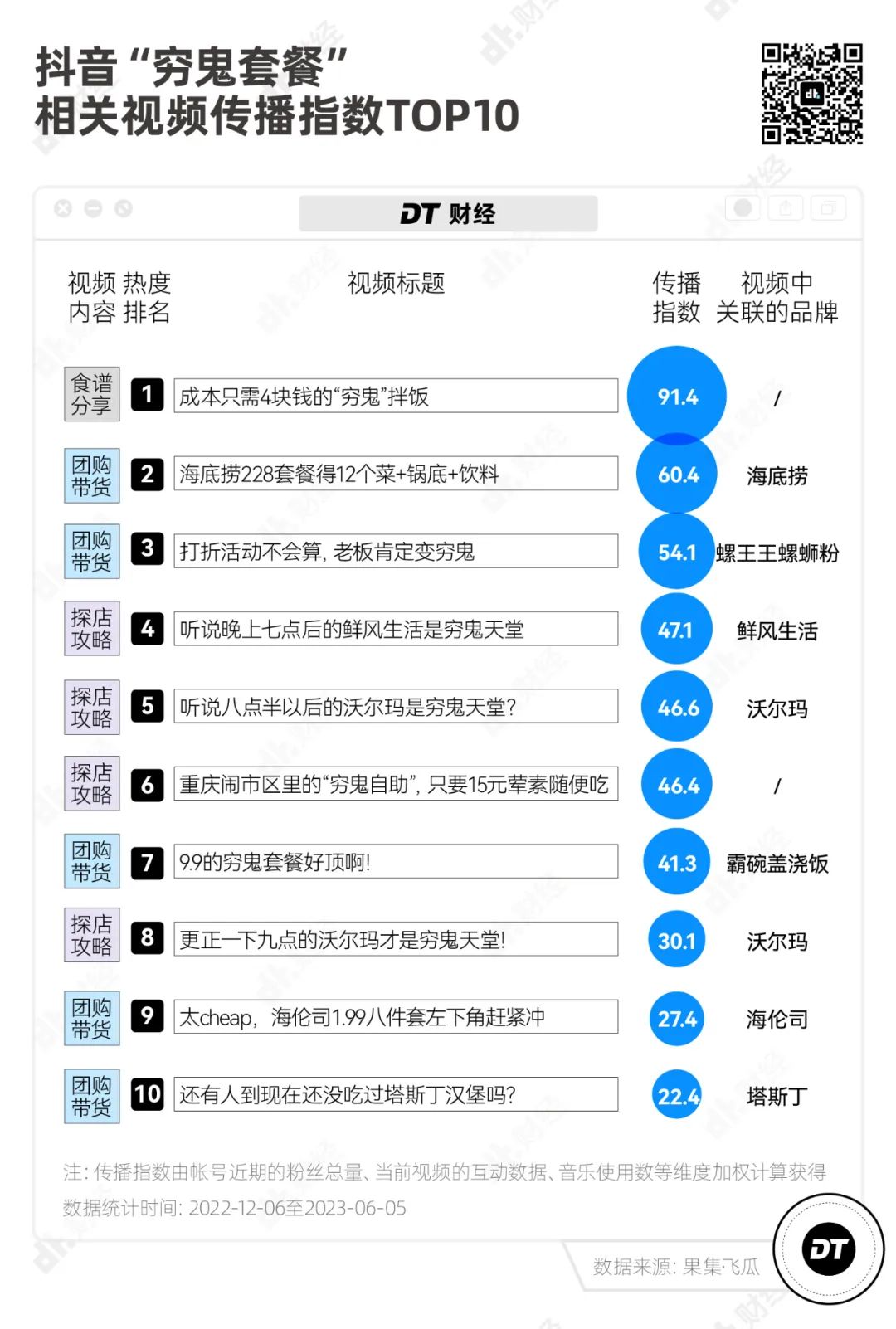 DT财经以“穷鬼套餐”为关键词,整理了近半年的抖音热门视频TOP10,这些视频主要有3类:一种是自己做饭的食谱分享,一种是线下探店攻略,比如晚上7点后去鲜风生活、8点半之后去沃尔玛买打折菜。