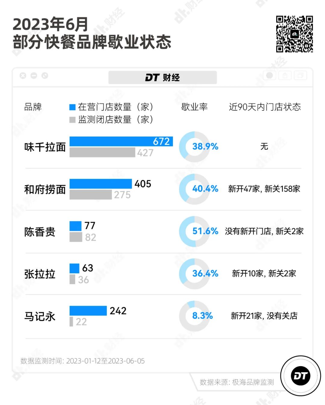 极海品牌监测显示,2023年和府捞面总共歇业275家,歇业率达到40%。近90天更惨,和府捞面新开47家门店,新关158家门店。其他连锁快餐品牌如味千拉面、陈香贵、张拉拉等也面临类似困境。