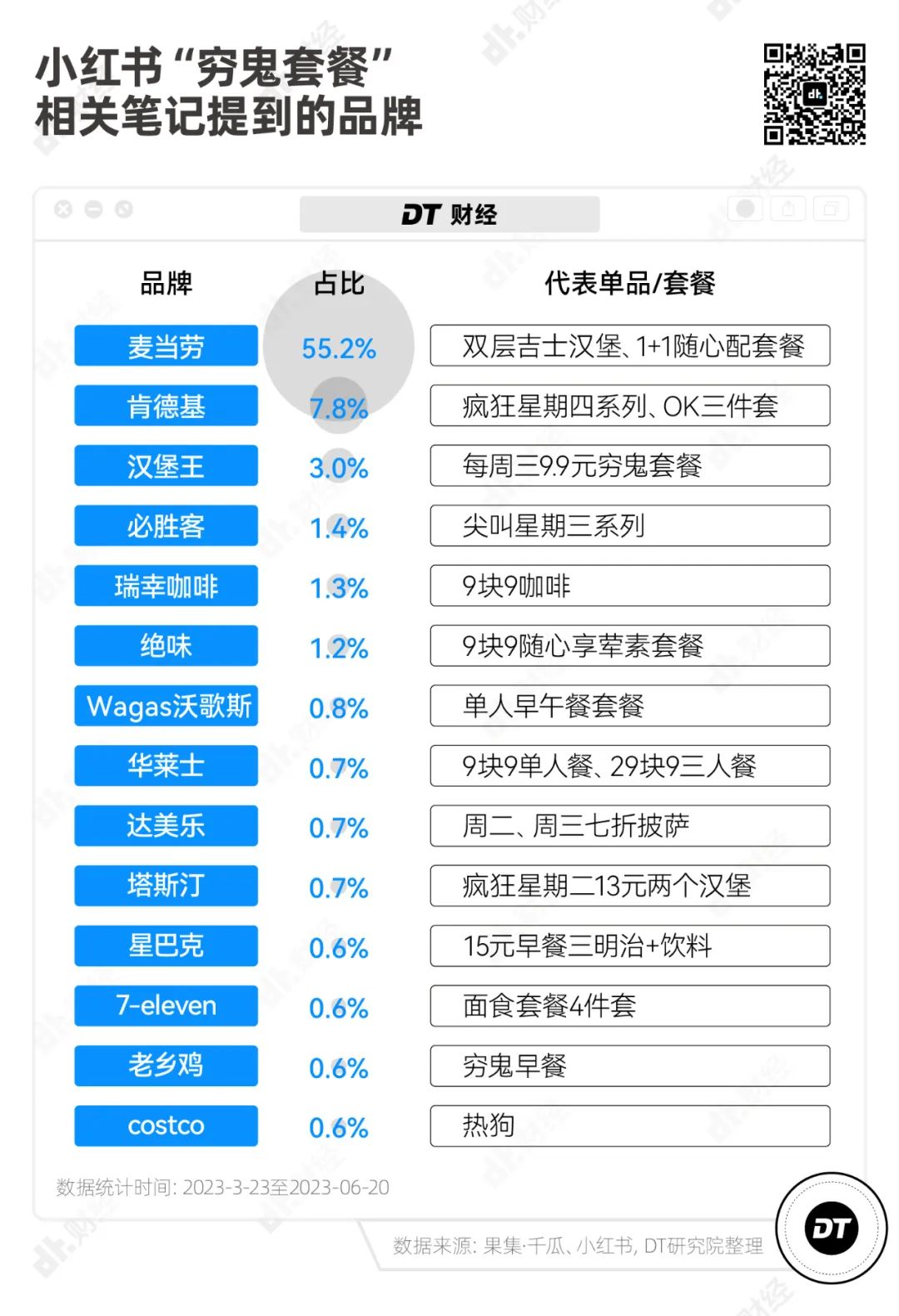 为了找出最近最受年轻人欢迎的穷鬼套餐是什么,DT财经以“穷鬼套餐”为关键词,采集了近3个月小红书笔记里提到的品牌,结果不出人所料,超过一半都是麦当劳,代表产品就是13.9元的1+1随心配套餐。