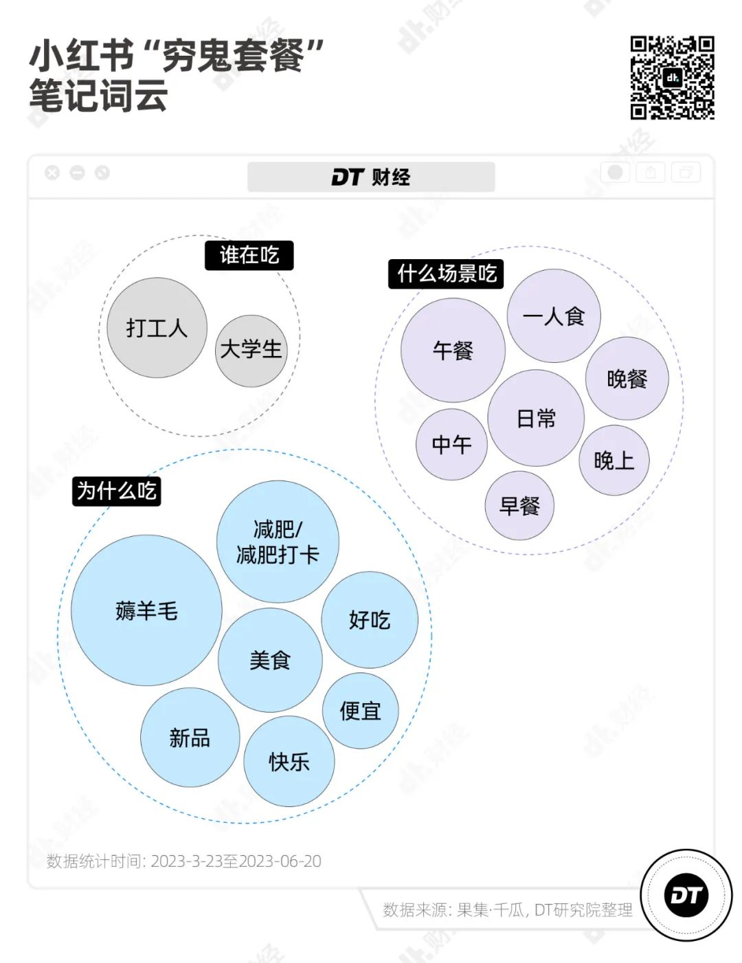 穷鬼套餐也能满足人们的真实需求。根据小红书“穷鬼套餐”相关笔记的词云,我们发现,“穷鬼套餐”的受众主要是打工人和大学生,最常见的食用场景是午餐和一人食,而它受欢迎的原因主要有三点:便宜、减肥和好吃。