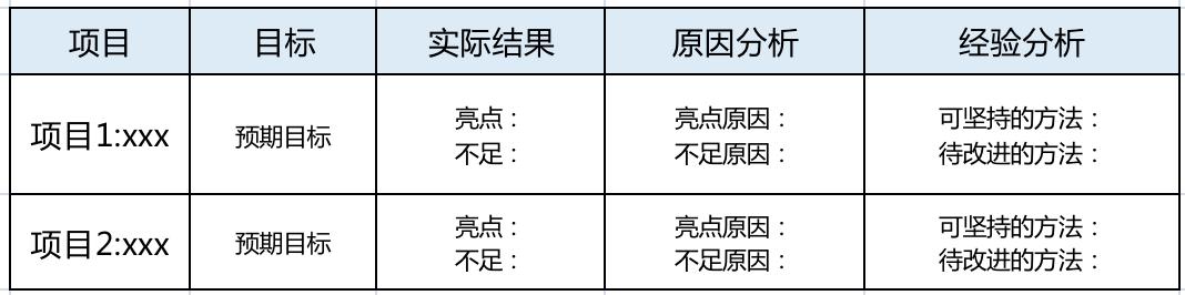 可以按照下表,针对每项工作列举出原因和经验总结。