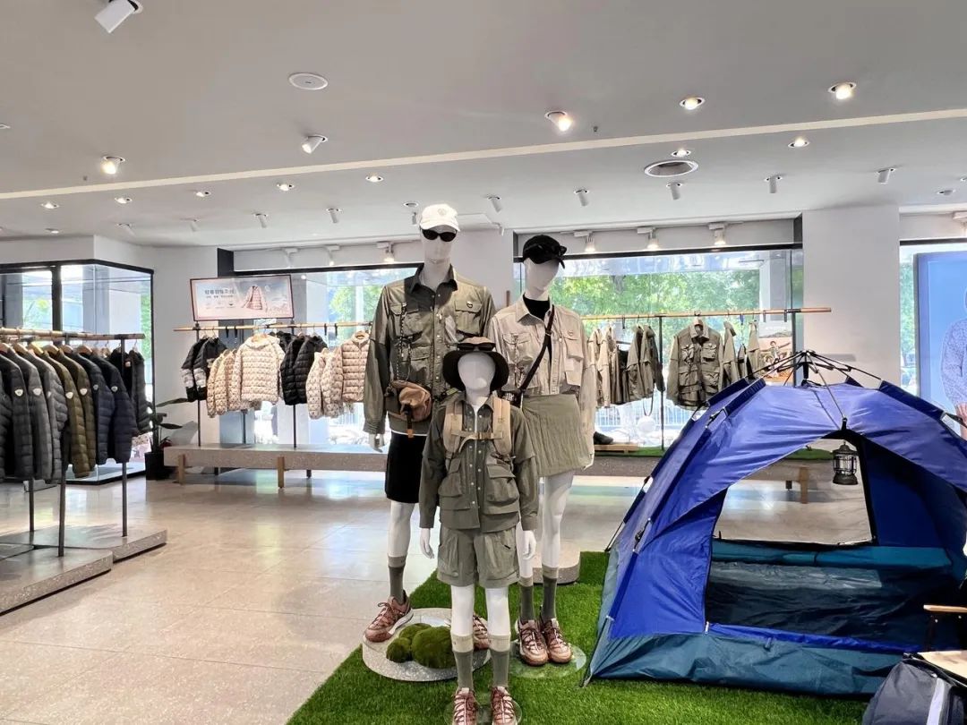 其中,有一家近200平方米的波司登门店内,波司登专门在最显眼的位置摆放了一个“骄阳系列”防晒产品展示台,地面画上了海浪、沙子的特效,展台中间站着穿防晒产品的一家三口模特,头顶防晒伞,周边摆放了桌椅等物品。除此之外,针对户外场景、儿童,波司登也专门留出了空间展示商品,而羽绒服却被挪到了角落里。